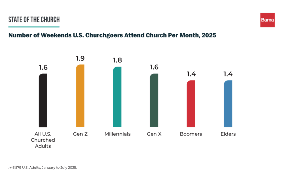 El informe señala que los miembros de la Generación Z asisten a la iglesia una media de 1,9 fines de semana al mes, mientras que los Millennials lo hacen 1,8 veces, cifras que suponen un aumento sostenido desde la pandemia y los niveles más altos registrados para jóvenes adultos desde que Barna comenzó a medir la participación generacional. En contraste, los Boomers asisten actualmente 1,4 veces por mes, y la Generación X los supera ligeramente con 1,6.