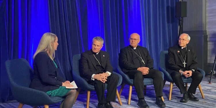 Maura Moser (izquierda), directora de la Campaña de Comunicaciones Católicas, modera un debate sobre inmigración con varios obispos de Estados Unidos en noviembre de 2025 en Baltimore. / Crédito: Shannon Mullen / National Catholic Register