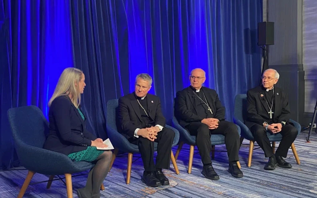 Maura Moser (izquierda), directora de la Campaña de Comunicaciones Católicas, modera un debate sobre inmigración con varios obispos de Estados Unidos en noviembre de 2025 en Baltimore. / Crédito: Shannon Mullen / National Catholic Register