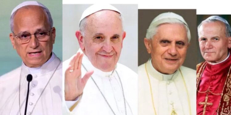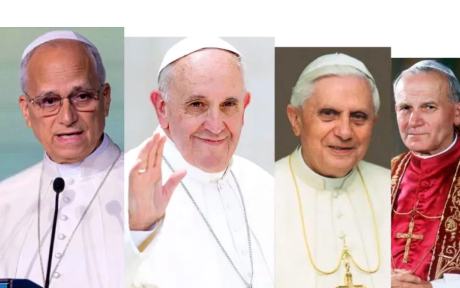 El Papa León XIV, seguido por los difuntos pontífices Francisco, Benedicto XVI y Juan Pablo II. / Crédito: Vatican Media