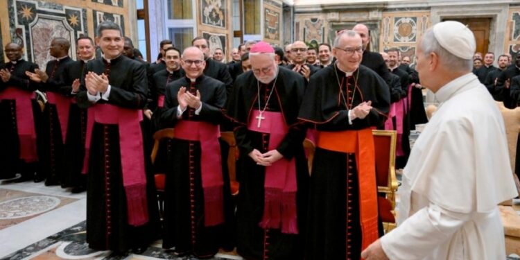 (ZENIT Noticias / Ciudad del Vaticano, 18.11.2025).- Personal diplomático de la Santa Sede, en su mayoría sacerdotes con funciones diplomáticas, fue recibido en audiencia pontificia el lunes 17 de noviembre en la Sala Clementina del Palacio Apostólico. El encuentro tenía lugar en el contexto de una jornada de oración y diálogo organizada y promovida por la Secretaría de Estado. Muchos de estos sacerdotes que ya trabajan en las diferentes Nunciaturas (embajadas) de la Santa Sede en el mundo, serán los futuros nuncios del Papa. A continuación la traducción realizada por ZENIT de las palabras del Papa: