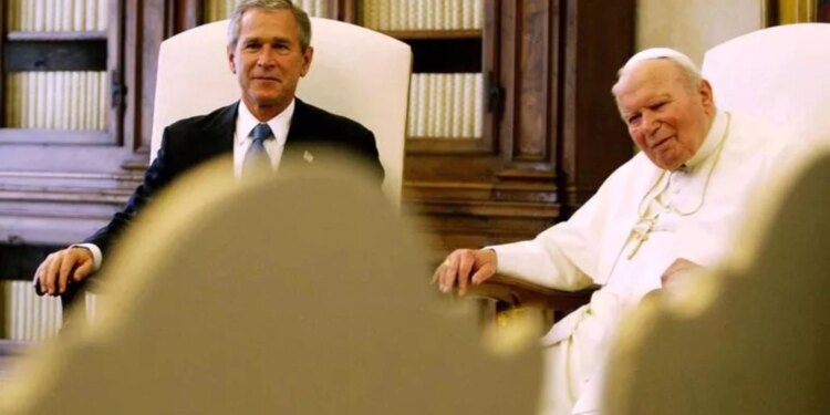 El presidente estadounidense George W. Bush sonríe durante su encuentro con el Papa Juan Pablo II en la Sala Clementina del Vaticano, el viernes 4 de junio de 2004. En marzo de 2003, Juan Pablo II habló pública y repetidamente contra los planes del presidente Bush de invadir Irak. / Crédito: AP Photo/Vincenzo Pinto, Pool.