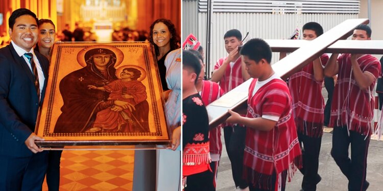 Estos símbolos son la Cruz de la JMJ y una réplica del ícono de las Salus Populi Romani, la imagen mariana cuyo cuadro original se custodia en la Basílica de Santa María la Mayor, en Roma.