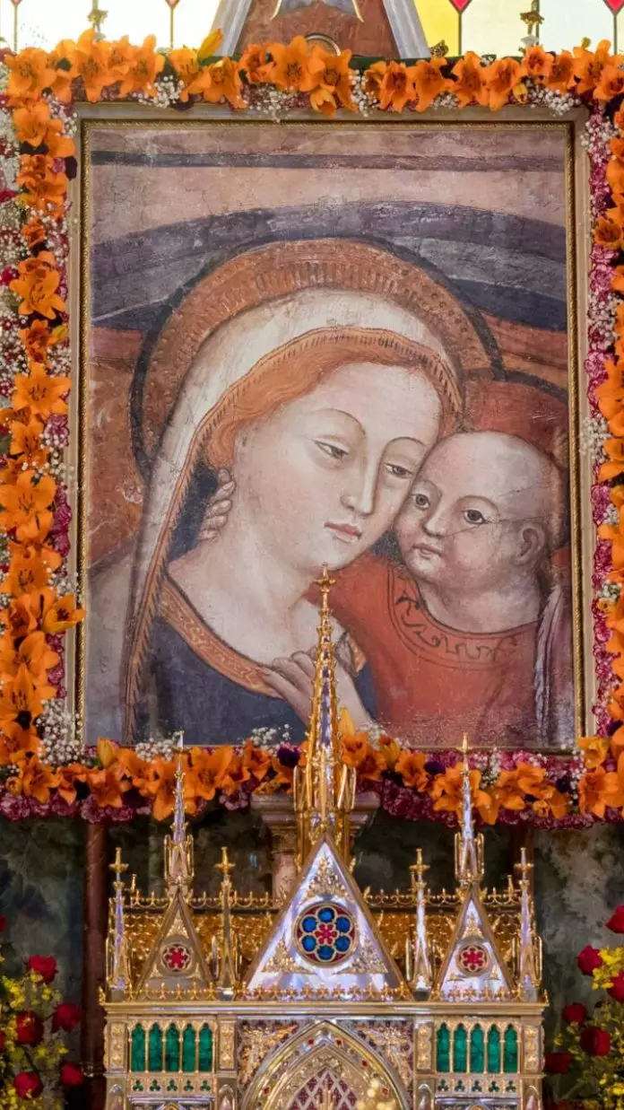 Versión suscinta de la maravillosa historia del fresco de la Virgen que cuelga en el aire en un bello pueblito de Italia.
