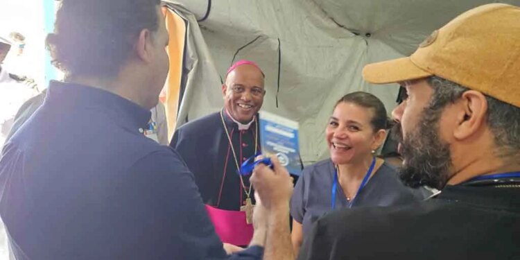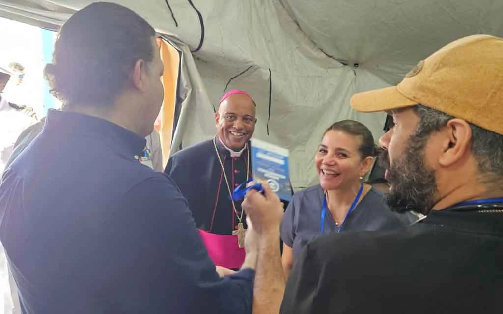 El obispo de Stella Maris con algunos participantes de las misiones médicas en Santo Domingo, República Dominicana, en una de las carpas de atención. / Crédito: Diócesis de Stella Maris.