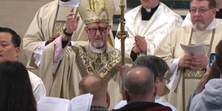 El obispo James D. Conley de la Diócesis de Lincoln, Nebraska (Estados Unidos), celebró la Misa en la Vigilia Nacional de Oración por la Vida en el Santuario Nacional de la Inmaculada Concepción en Washington, D.C., el jueves 22 de enero. / Crédito: EWTN.