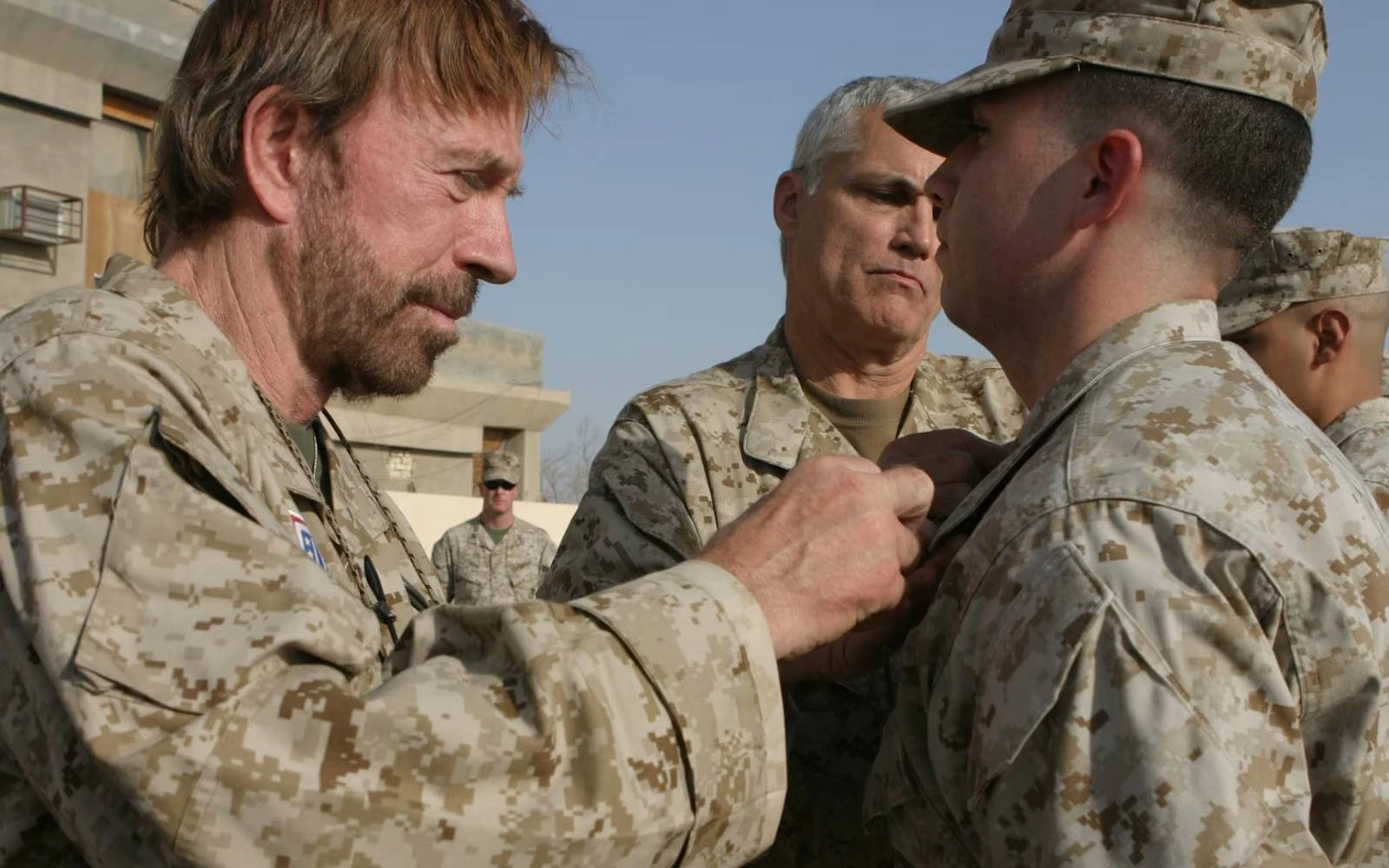 El actor Chuck Norris (izquierda) visita el campamento Taqaddum de la Organización de Servicios Unidos (USO) en la provincia de Al Anbar, Irak, en noviembre de 2006. / Crédito: Fotografía del Departamento de Defensa por la sargento Alicia J. Brito, Cuerpo de Marines de los Estados Unidos.
