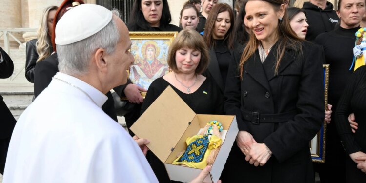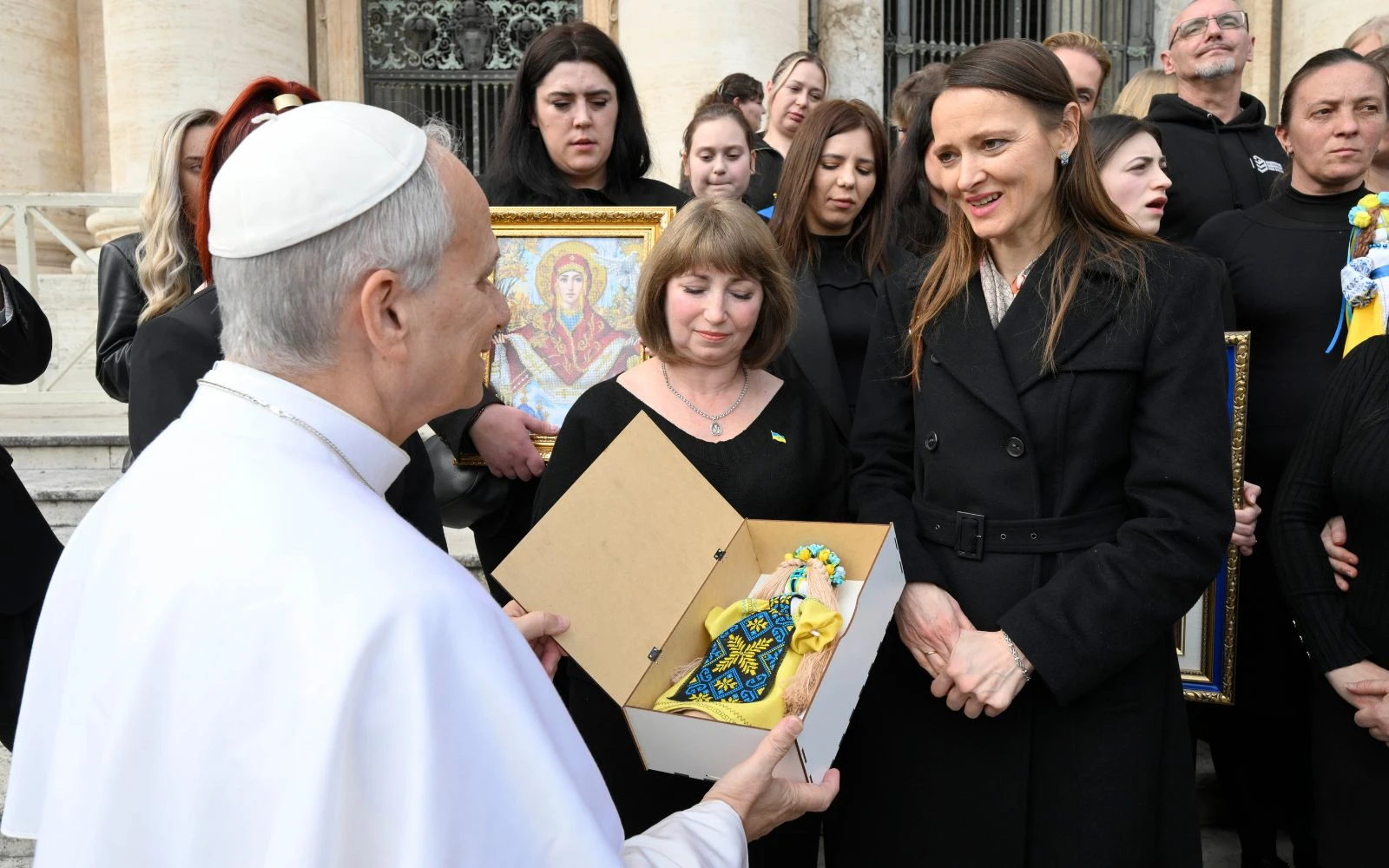 Algunas mujeres ucranianas pudieron conversar brevemente con el Papa León XIV tras la audiencia general / Crédito: Vatican Media