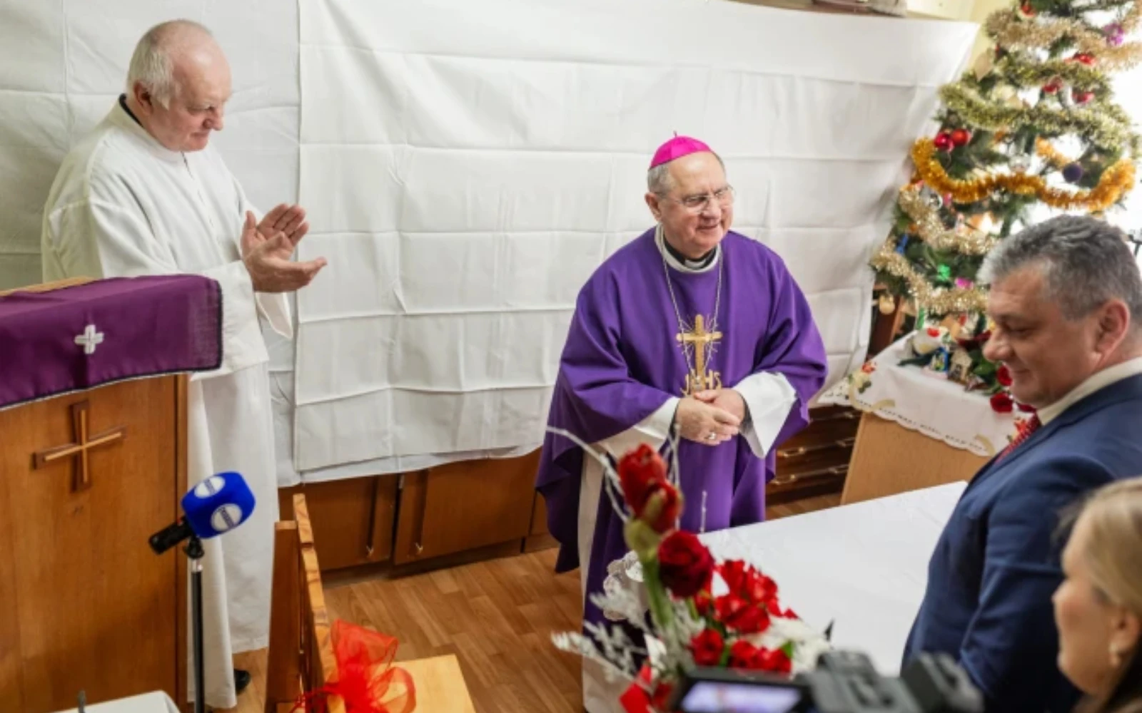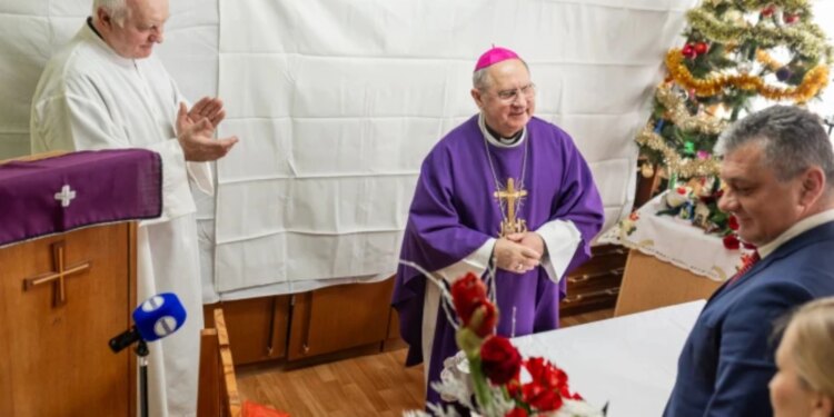 El Arzobispo Bernard Bober celebra una misa con personas sin hogar y necesitadas en la Caridad Arquidiocesana de Košice, Eslovaquia, durante una tradicional reunión navideña en diciembre de 2025. / Crédito: Caridad Arquidiocesana de Košice