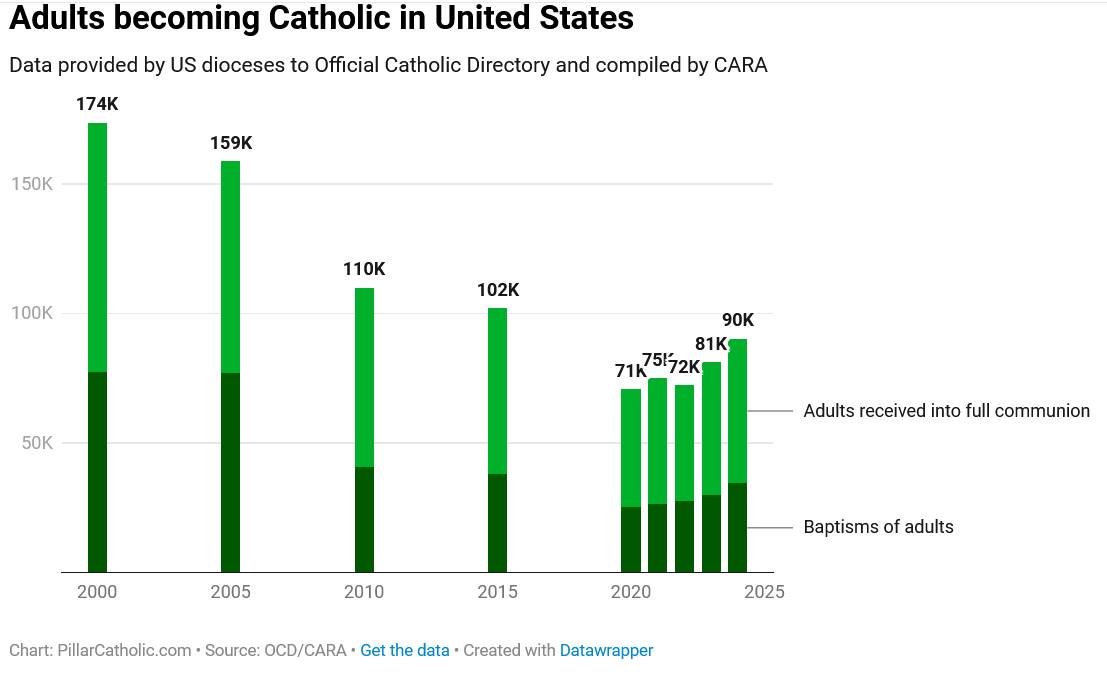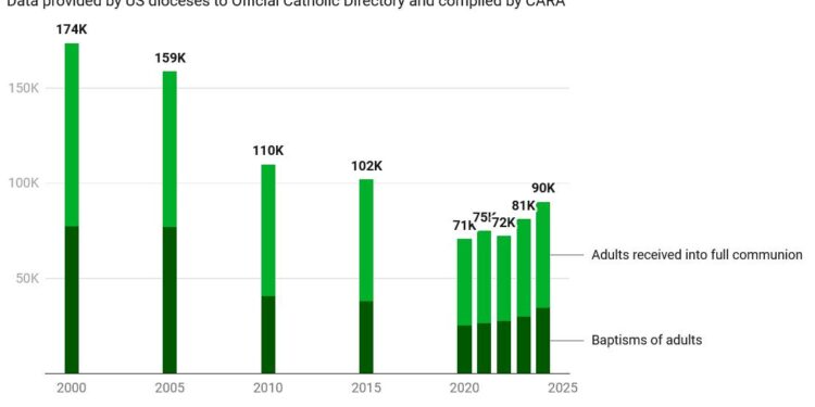 Miles de adultos han sido recibidos en la Iglesia católica esta Pascua en Estados Unidos, con aumentos del 83 % respecto a 2024, pero las cifras aún no alcanzan las de hace 25 años.