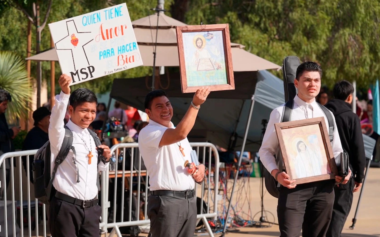 Participantes de One Life LA el 24 de enero de 2026 sostienen carteles que dicen: «Quien tiene amor no se mide para hacer el bien». / Crédito: Cortesía de la Arquidiócesis de Los Ángeles.