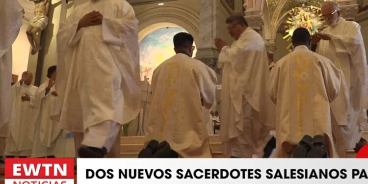 Los dos nuevos sacerdotes salesianos (de rodillas) ordenados en Perú. / Crédito: EWTN Noticias