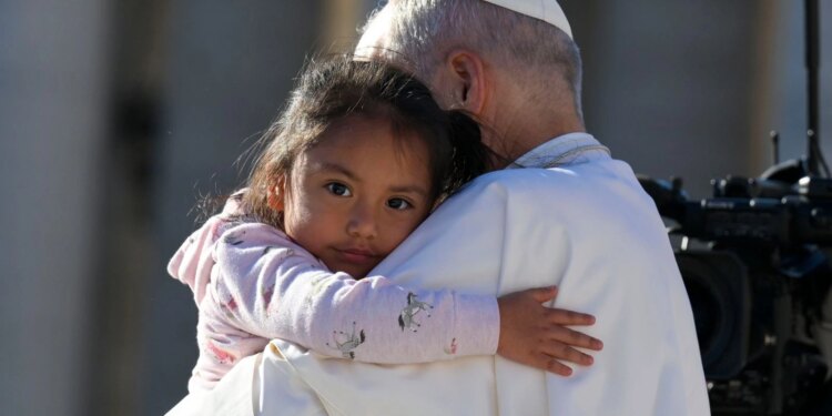 El Papa León XIV abraza a una niña durante una Audiencia General / Crédito: Vatican Media