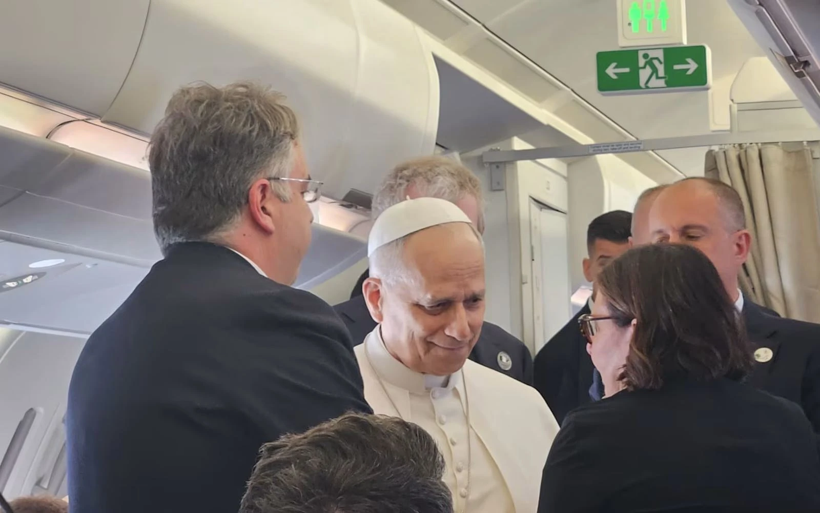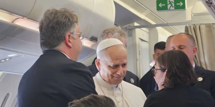El Papa León XIV habla con los periodistas a bordo del avión papal rumbo a Argelia, el 13 de abril de 2026. / Crédito: Marco Mancini/EWTN News.