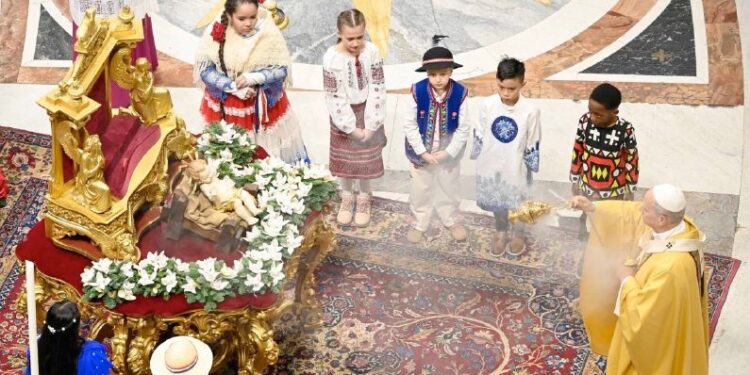 (ZENIT Noticias / Ciudad del Vaticano, 24.12.2025).- Por la noche del miércoles 24 de diciembre, el Papa León XIV presidió la misa de Nochebuena en ocasión de la Navidad. Debido a que dentro de la basílica, por razones de seguridad, solo hubo lugares para 6 mil personas, unas 5 mil se congregaron en la Plaza de San Pedro para participar desde allí, no obstante el frío y la lluvia. En atención a eso, antes de iniciar la misa el Papa León XIV fue al exterior de la basílica y desde allí saludó a las personas congregadas en la Plaza, a las cuales le dijo: