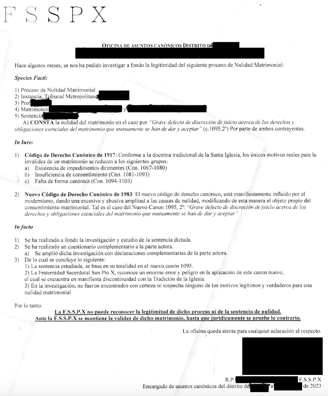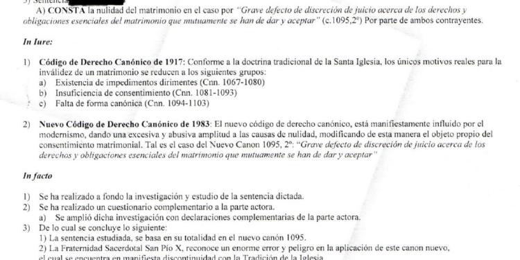 Ya que Roma está en «conversaciones» con la Fraternidad Sacerdotal San Pío X, habría que preguntarles por qué no reconocen ciertas nulidades matrimoniales cuando la Iglesia sí lo hace luego de un largo proceso canónico.
