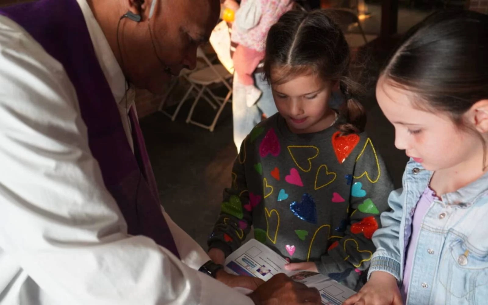 El párroco asociado, el P. Joji Reddy Allam, coloca una calcomanía en el portapapeles de Brettie Danforth, estudiante de primer grado, después de la misa del 21 de febrero de 2026. / Crédito: Malea Hargett