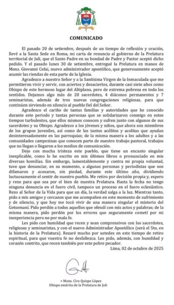 Días después de que el Papa León XIV aceptara su renuncia al gobierno pastoral de la Prelatura de Juli en medio de denuncias y cuestionamientos por escándalos sexuales y financieros, Mons. Ciro Quispe López publicó un comunicado de despedida dirigido a los fieles de esta jurisdicción del Altiplano peruano. El texto fue difundido el 2 de octubre en el perfil oficial de la Prelatura de Juli por el Administrador Apostólico, Mons. Giovanni Cefai, Mssp.