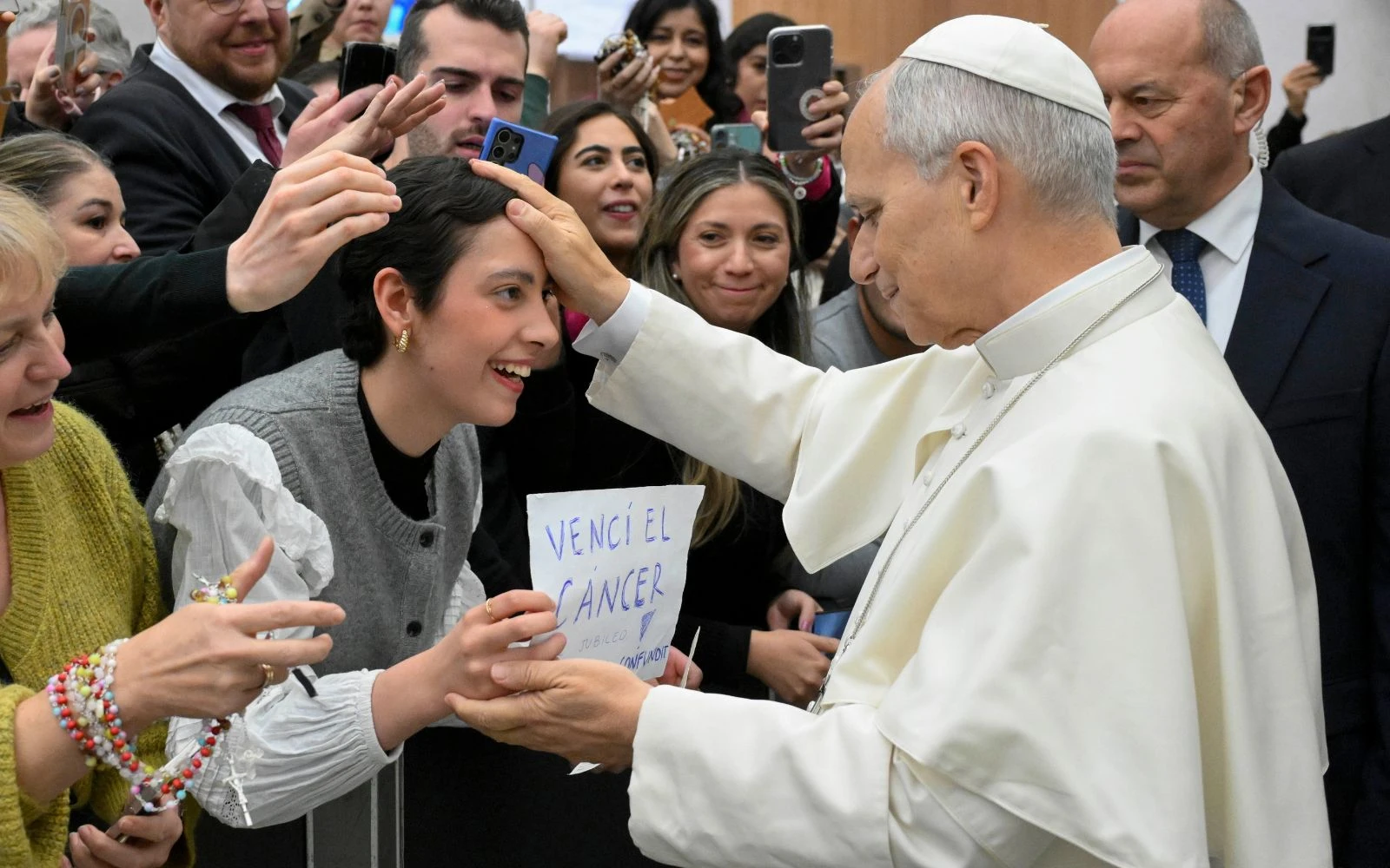El Papa León XIV bendice una joven que superó un cáncer en una Audiencia General en el Aula Pablo VI del Vaticano / Crédito: Vatican Media