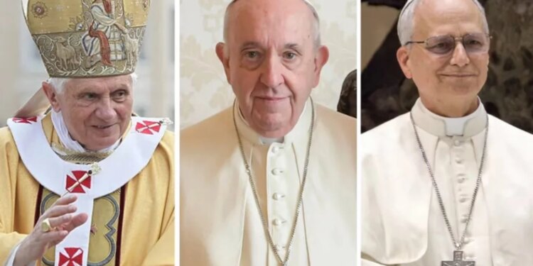 Papa Benedicto XVI, Papa Francisco y el Papa León XIV. / Crédito: Wikimedia Commons / Dominio público.