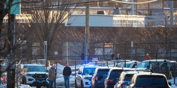 La policía se encuentra fuera del perímetro creado alrededor del estadio Dennis M. Lynch, donde se produjo un tiroteo en Pawtucket, Rhode Island, el lunes 16 de febrero de 2026. / Crédito: Joseph Prezioso/AFP vía Getty Images