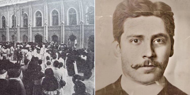 Multitud de caraqueños aglomerada frente a la Universidad Central de Venezuela, durante el velorio del Dr. José Gregorio Hernández (izq.) Retrato del «médico de los pobres» en su juventud. / Crédito: Arquidiócesis de Caracas.