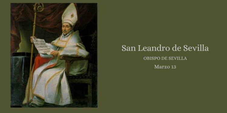 Nacido en Cartagena, hermano de Florentina, Fulgencio e Isidoro, todos ellos santos, s. Leandro, fue un monje benedictino que convirtió la dinastía real visigoda del arrianismo. Como obispo de Sevilla en 589 convocó el Concilio de Toledo para sancionar tal pasaje histórico. Murió en el año 600.