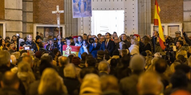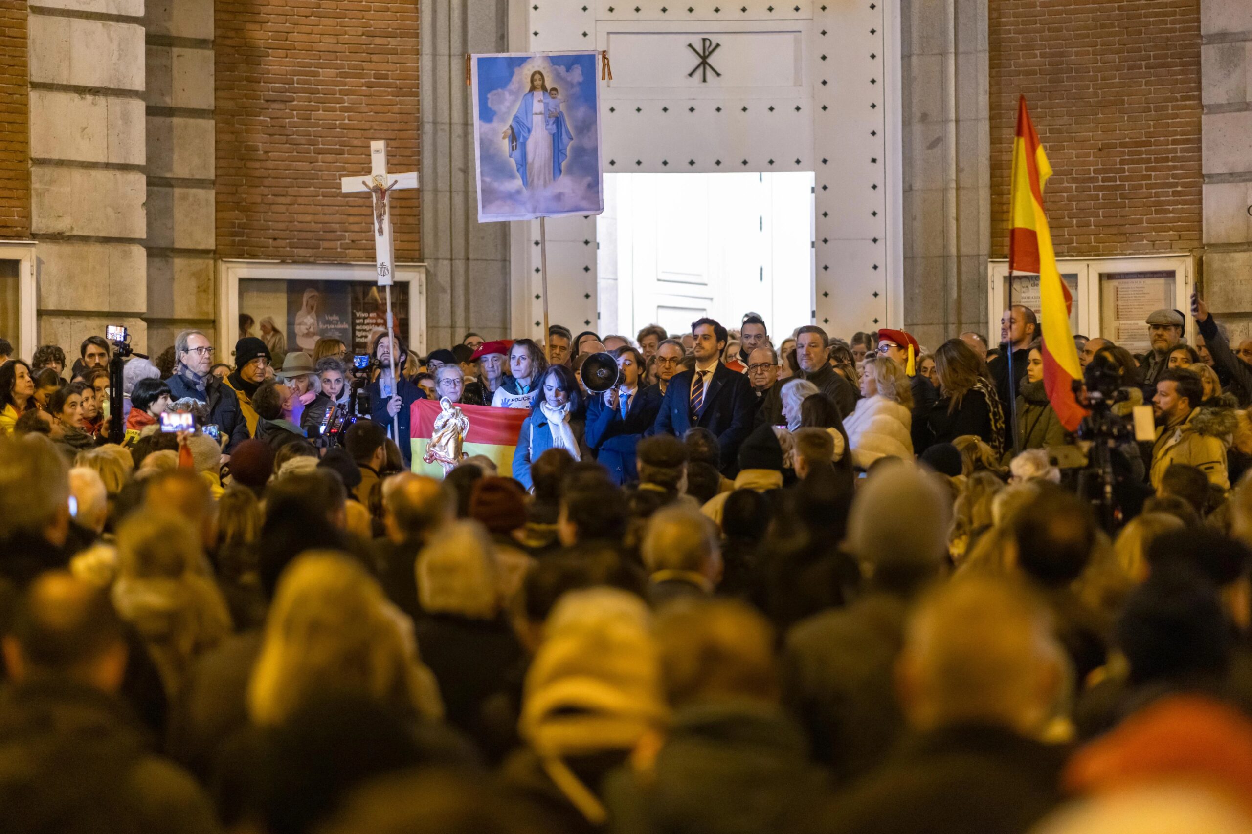 Laicos congregados ante el Santuario de la Inmaculada Concepción en Madrid para rezar el Rosario por España. / Crédito: ACI Prensa.