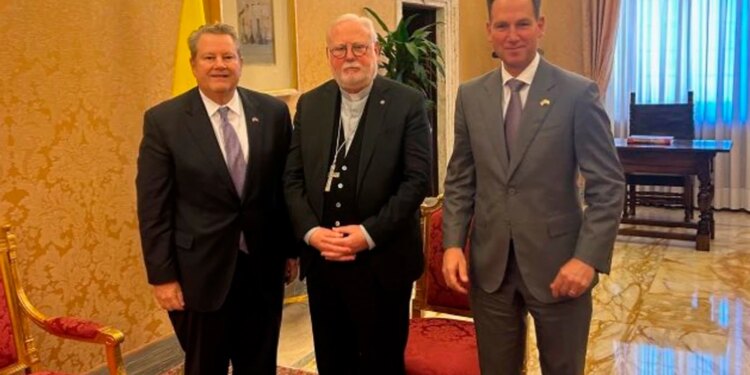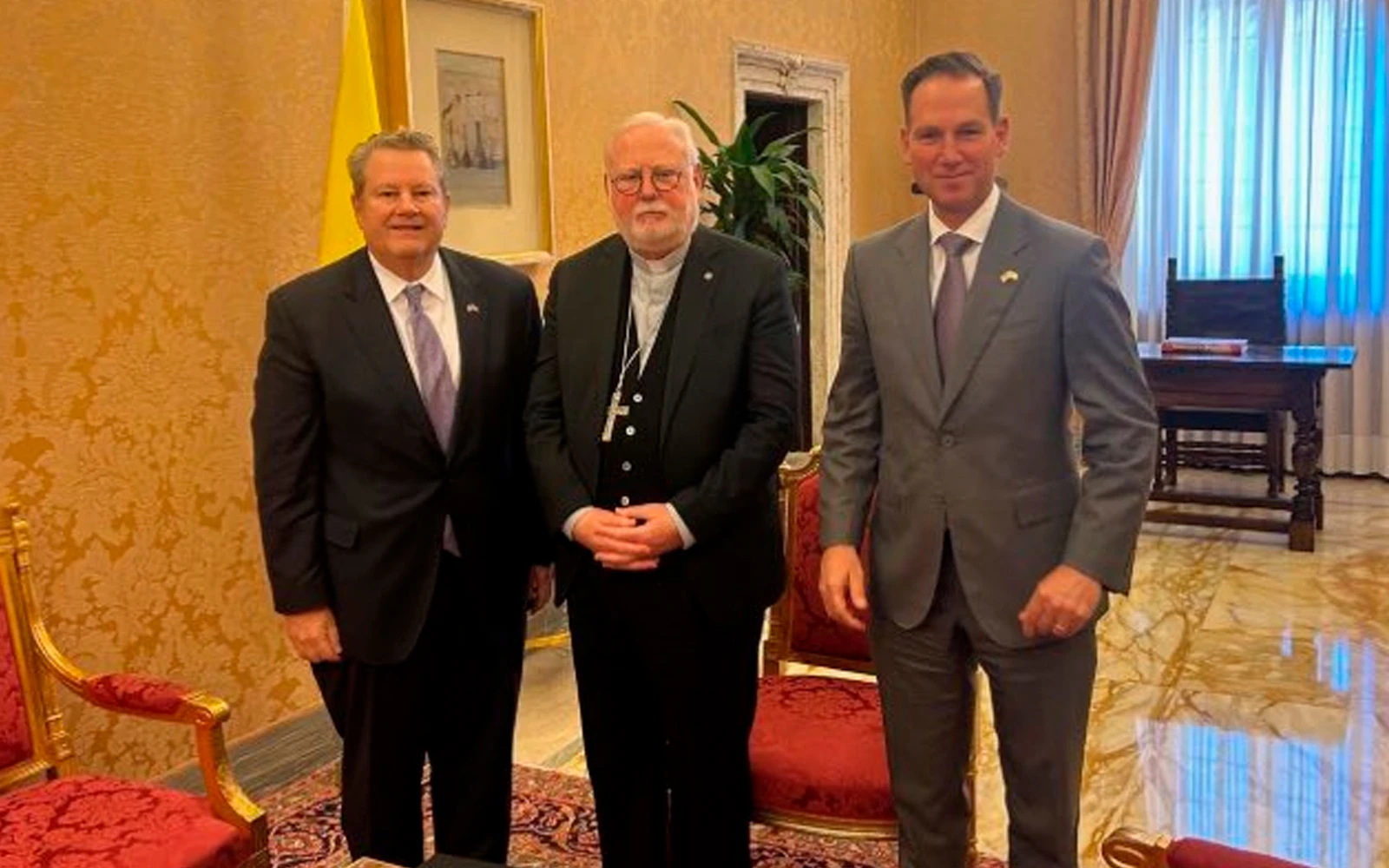 Los embajadores de Estados Unidos en Cuba y en la Santa Sede, Mike Hammer y Brian Burch, junto con el Arzobispo Paul Richard Gallagher, secretario vaticano para las Relaciones con los Estados. / Crédito: Embajada de los Estados Unidos en la Santa Sede.