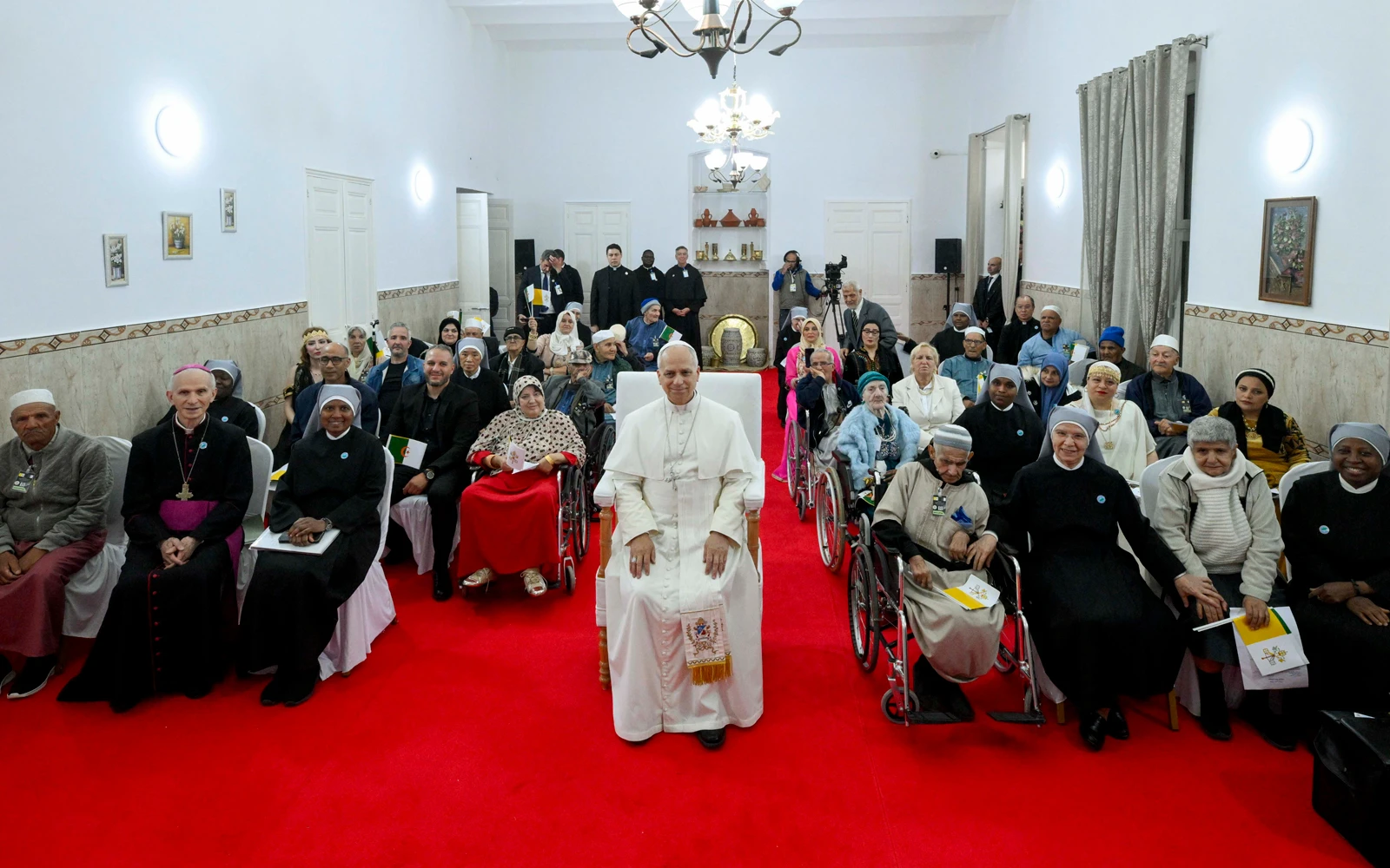 El Papa León XIV con las Hermanitas de los Pobres y los ancianos de la casa de acogida en Argelia. / Crédito: Vatican Media.