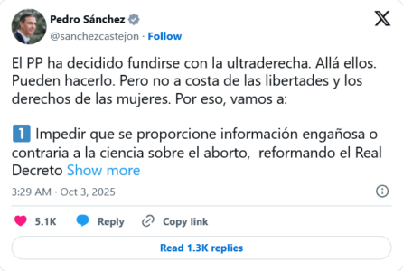 “El PP ha decidido fundirse con la ultraderecha. Allá ellos. Pueden hacerlo. Pero no a costa de las libertades y los derechos de las mujeres”, escribió Sánchez en su publicación. Y añadió: “Con este…