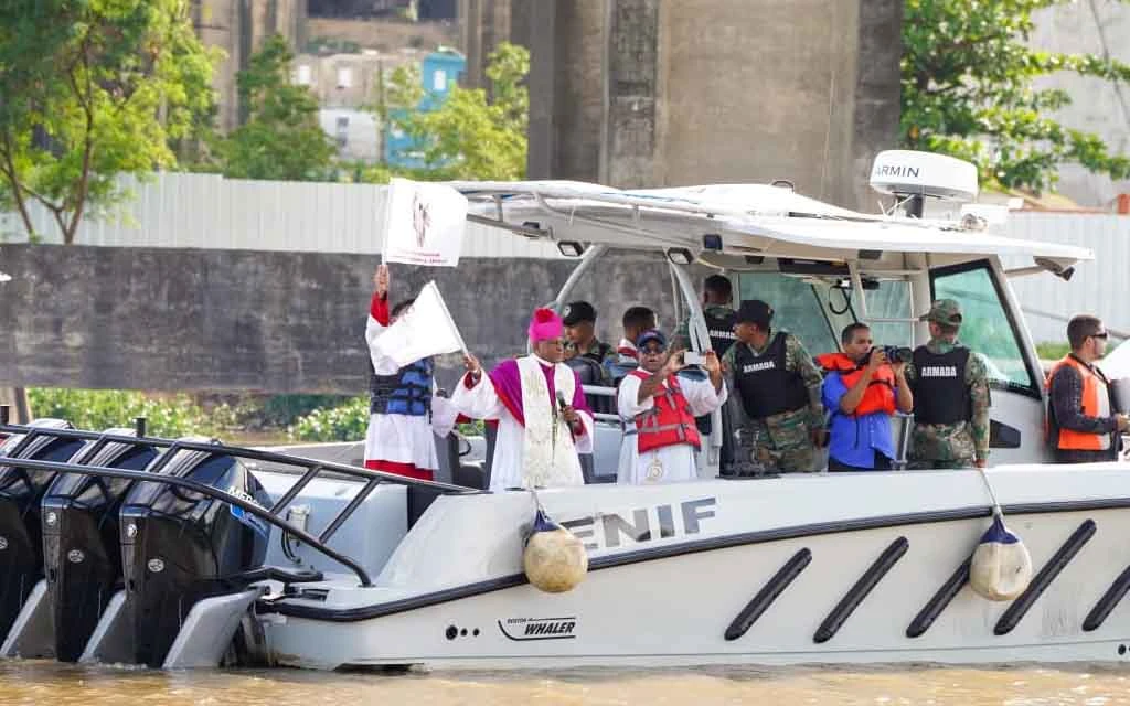 El obispo Manuel Antonio Ruiz a bordo de una de las embarcaciones en el río Ozama el 5 de abril / Crédito: Diócesis de Stella Maris.
