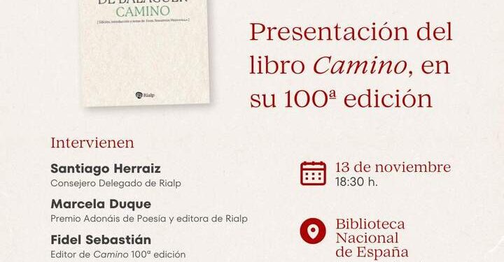 Este jueves 13 de noviembre, a las 18:30 horas, tendrá lugar en la Biblioteca Nacional de España la presentación de la edición número 100 en castellano de Camino, la obra literaria más conocida del santo aragonés Josemaría Escrivá de Balaguer. Un libro de espiritualidad que ha traspasado fronteras y generaciones, convirtiéndose en el cuarto libro en castellano más traducido de la historia (después de El Quijote y dos de García Márquez) según el Instituto Cervantes.