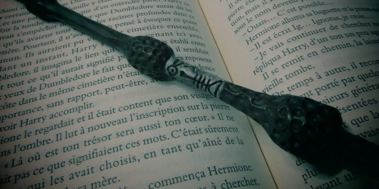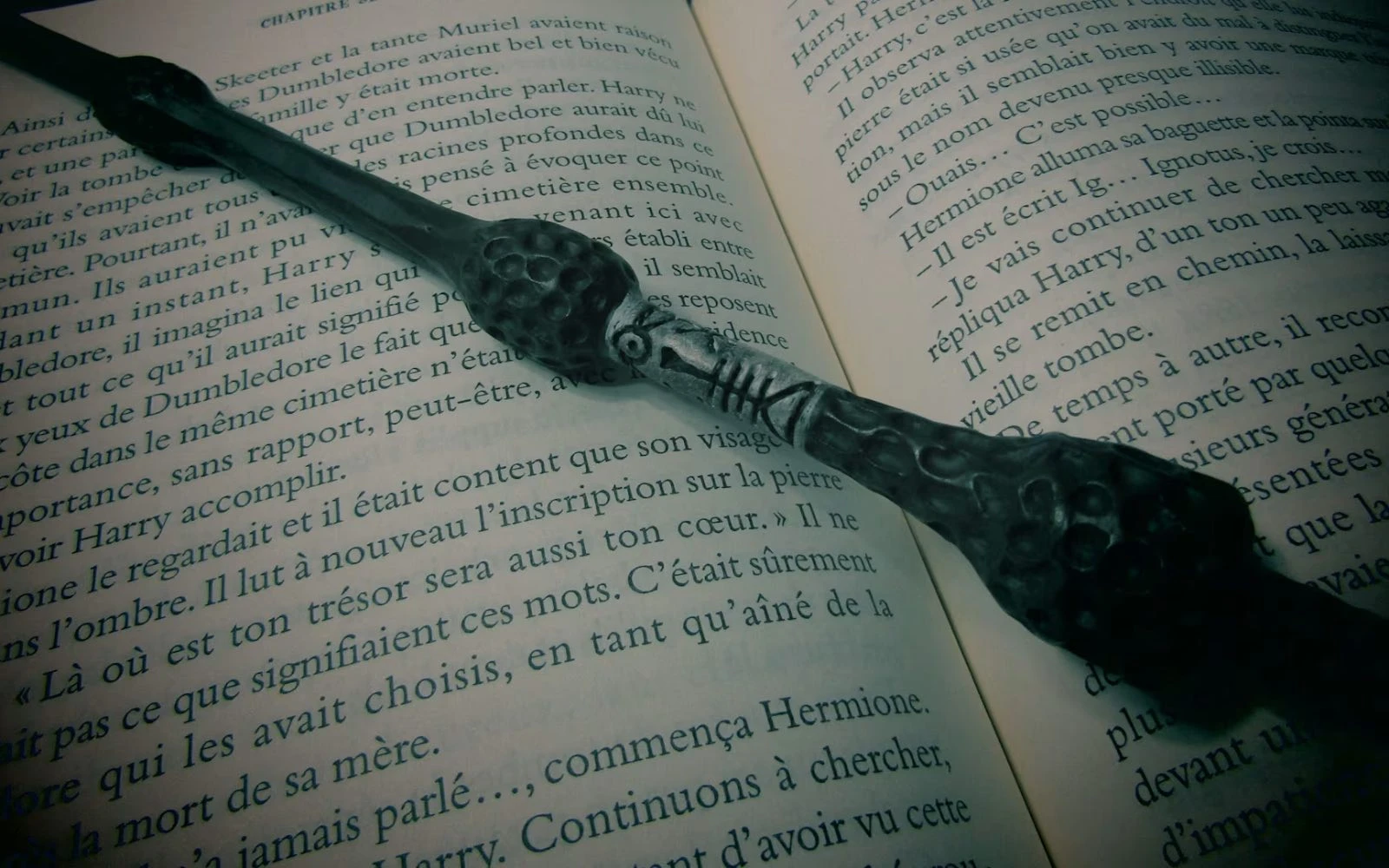Libro de Harry Potter y una réplica de una varita. / Crédito: Suzelfe vía Wikimedia Commons (CC BY-SA 4.0).
