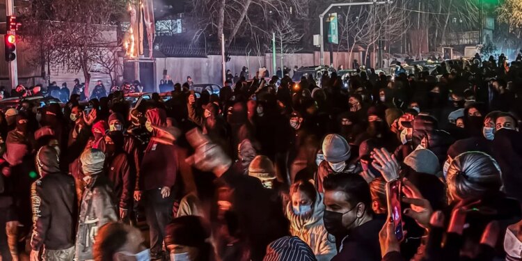 Iraníes se reúnen bloqueando una calle durante una protesta en Teherán (Irán) el 9 de enero de 2026. Las protestas a nivel nacional comenzaron en el Gran Bazar de Teherán contra las fallidas políticas económicas a finales de diciembre de 2025, y se extendieron a universidades y otras ciudades, incluyendo consignas económicas, políticas y antigubernamentales. / Crédito: MAHSA/Middle East Images/AFP vía Getty Images.