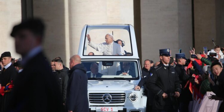 El Papa saluda a los fieles desde el papamóvil en la Plaza de San Pedro / Crédito:Mirjana Gabric