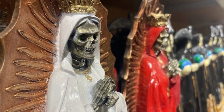 Estatuas del culto de la «Santa Muerte», con detalles característicos de la imagen de la Virgen de Guadalupe, a la venta en una tienda en México. / Crédito: David Ramos/ACI Prensa.
