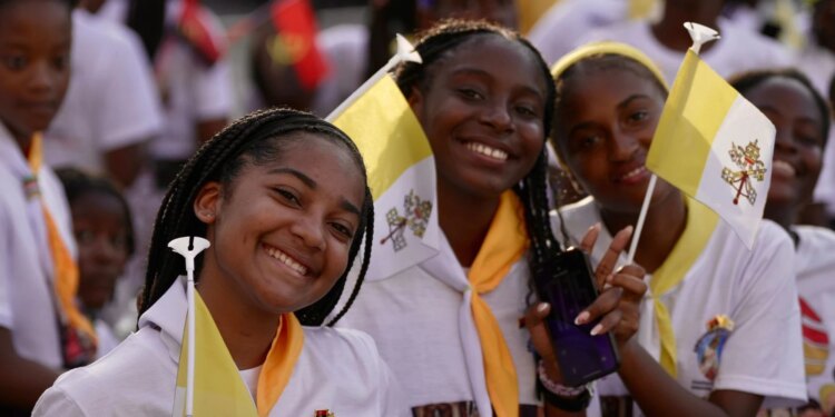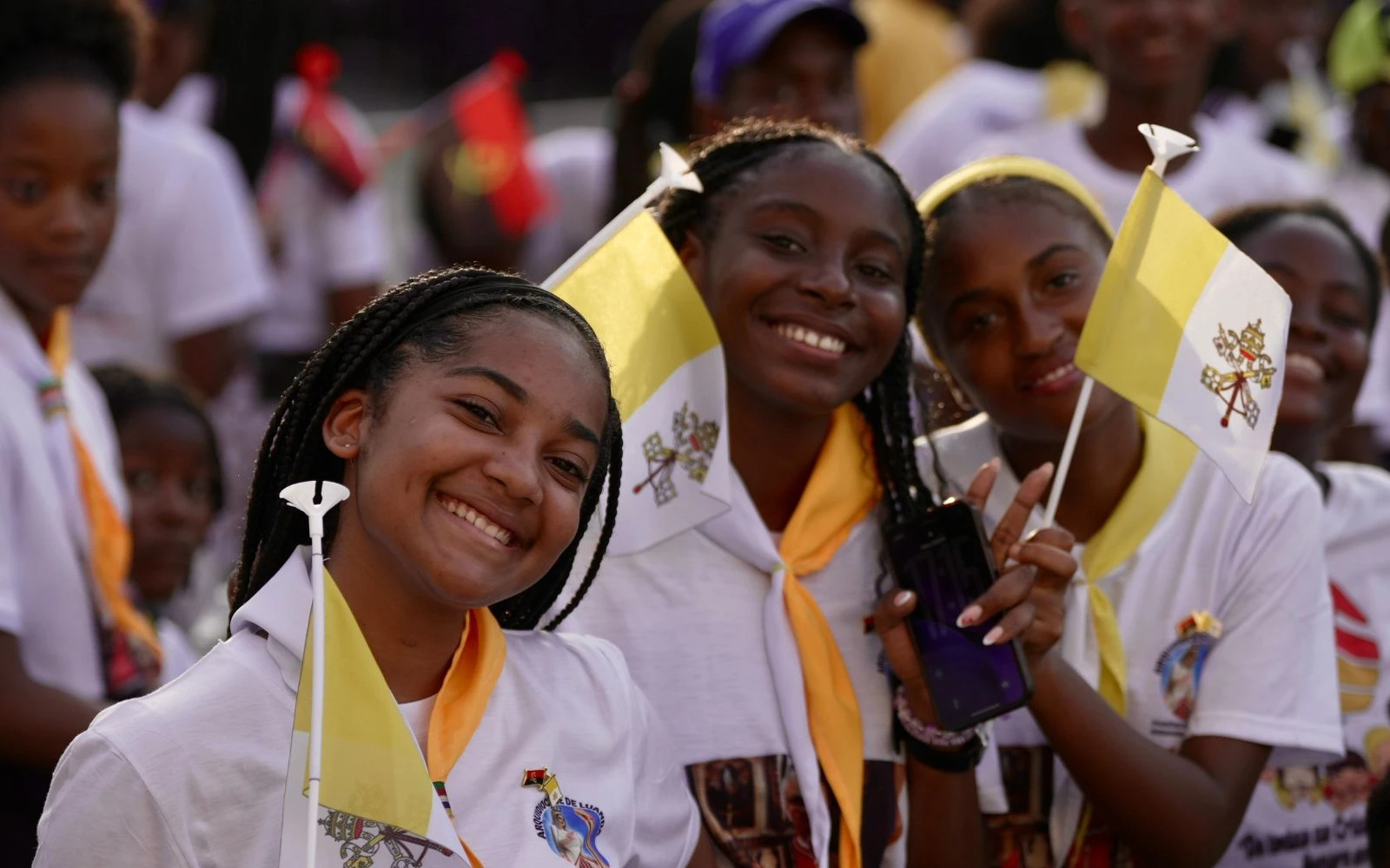 Jóvenes esperan la llegada del Papa León XIV a la parroquia de Nuestra Señora de Fátima en Luanda / Crédito: EWTN