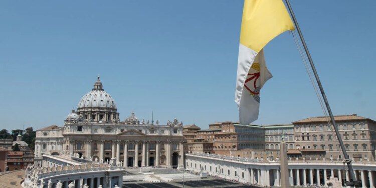 La bandera del Vaticano ondea sobre la Plaza de San Pedro. / Crédito: Bohumil Petrik / EWTN News.