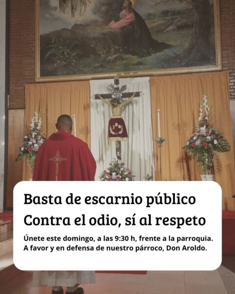 La concentración fue convocada a través de redes sociales bajo el lema “Basta de escarnio público. Contra el odio, sí al respeto”, con un cartel que animaba a reunirse el domingo a las 9:30 frente al templo “a favor y en defensa de nuestro párroco, Don Aroldo”.