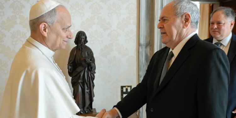 El Papa León XIV saluda a Dani Dayan, presidente de Yad Vashem, en el Vaticano el 23 de marzo de 2026. Al fondo: Yaron Sideman, embajador de Israel ante la Santa Sede. / Crédito: Vatican Media.