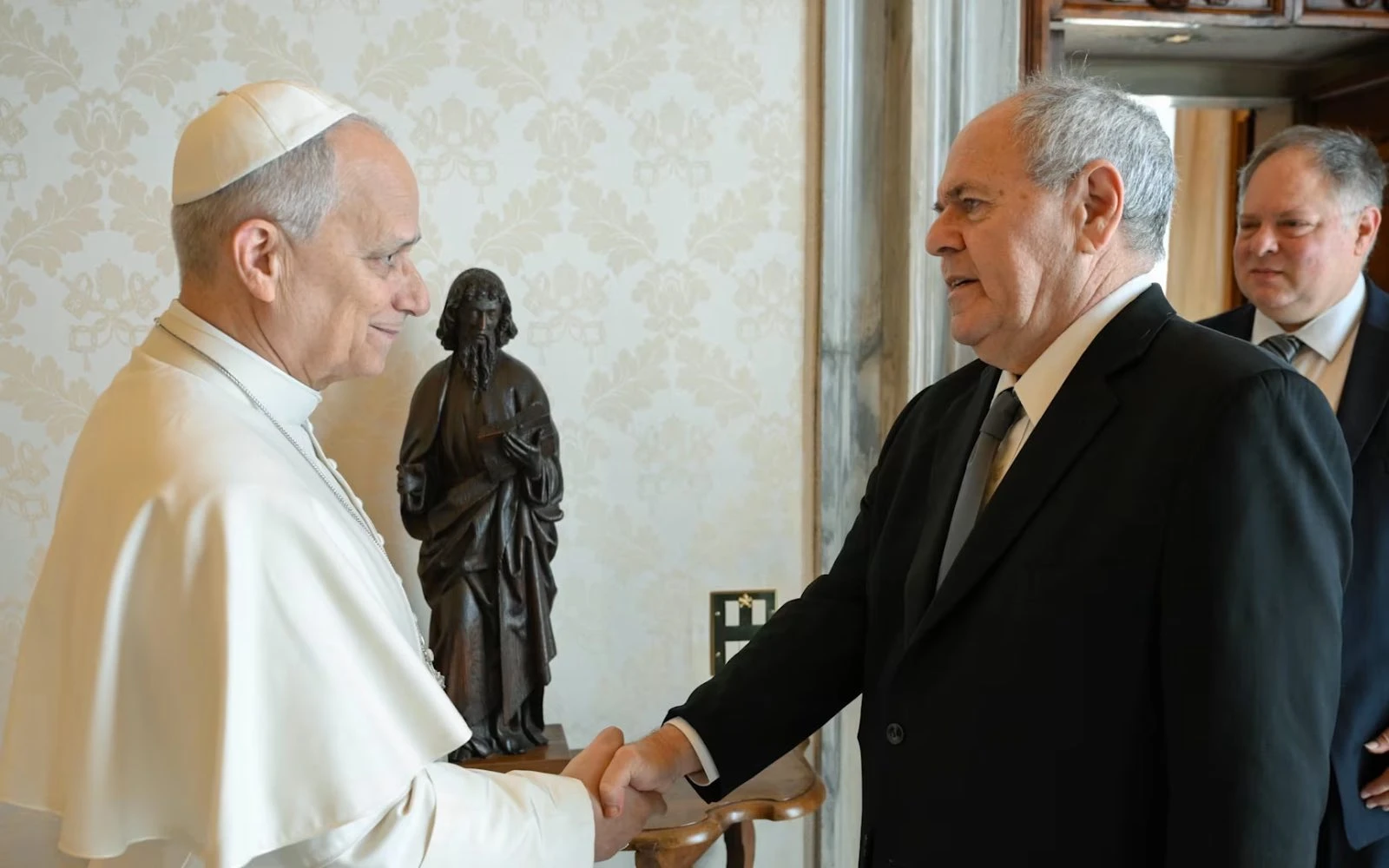El Papa León XIV saluda a Dani Dayan, presidente de Yad Vashem, en el Vaticano el 23 de marzo de 2026. Al fondo: Yaron Sideman, embajador de Israel ante la Santa Sede. / Crédito: Vatican Media.