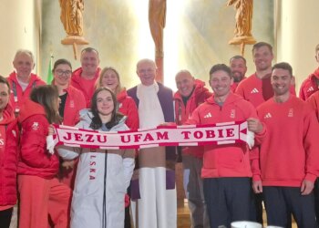 El P. Edward Pleń junto a los atletas polacos en los Juegos Olímpicos de Cortina, quienes sujetan una bandera con...