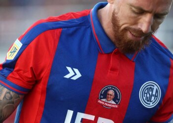 Read moreUn parche con la imagen del fallecido Papa Francisco se ve en la camiseta del centrocampista español número 10 de...