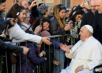 Read moreFieles estrechan la mano al Papa Francisco en el Aula Pablo VI del Vaticano / Crédito: Vatican Media , Mar...