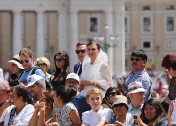 Read moreUna pareja de novios en traje de boda en la Plaza de San Pedro espera la bendición del Papa Francisco...