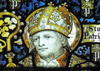 Read moreSan Patricio representado en la vidriera de C. E. Kempe en la parroquia de San Juan Bautista, Burford, Reino Unido...
