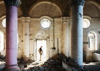 Read moreUn guardia de seguridad desconocido se encuentra en la entrada de una iglesia destruida durante los combates con ISIS en...