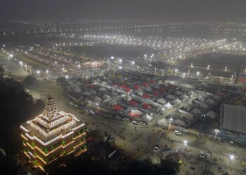 Read moreVista aérea de las carpas instaladas en Sangam antes del Maha Kumbh Mela en Prayagraj el 7 de enero de...